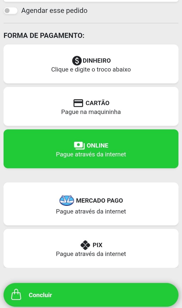 Você pode escolher entre várias formas de pagamento, como receber na entrega ou online pela plataforma via cartão ou pix.